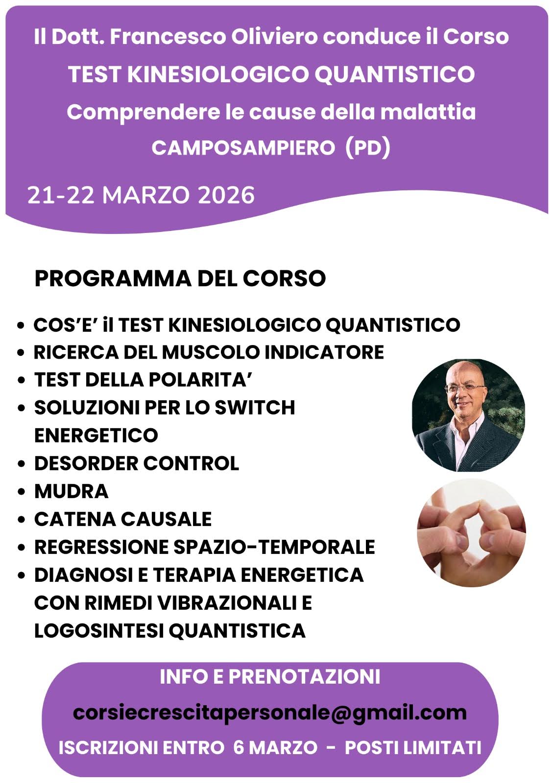 La kinesiologia quantistica arriva subito in profondità ed è uno dei modi migliori per parlare col nostro corpo, decodificandone il suo linguaggio, in quanto terreno di risonanza per i segnali energetici ambientali. Essa ci fornisce esatte informazioni circa tali campi, verificandoli attraverso test muscolari, e soprattutto permette l’apporto di correzioni tese al recupero dell’equilibrio dinamico.