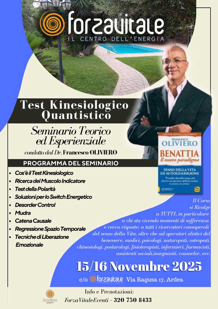 Sabato 15 Novembre 2025 (dalle 14:00 alle 20:00) e Domenica 16 Novembre (dalle 09:00 alle 17:00) si terrà presso la Associazione Forza Vitale il Seminario teorico ed esperienziale “Test Kinesiologico Quantistico” condotto dal Dottor Francesco Oliviero.